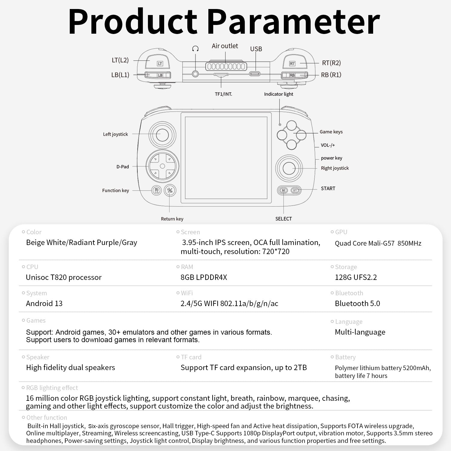 Built-in Hall joystick, Six-axis gyroscope sensor, Hall trigger, High-speed fan and Active heat dissipation, Supports FOTA wireless upgrade, Online multiplayer, Streaming, Wireless screencasting, USB Type-C Supports 1080p DisplayPort output, vibration motor, Supports 3.5mm stereo headphones, Power-saving settings, Joystick light control, Display brightness, and various function properties and free settings.