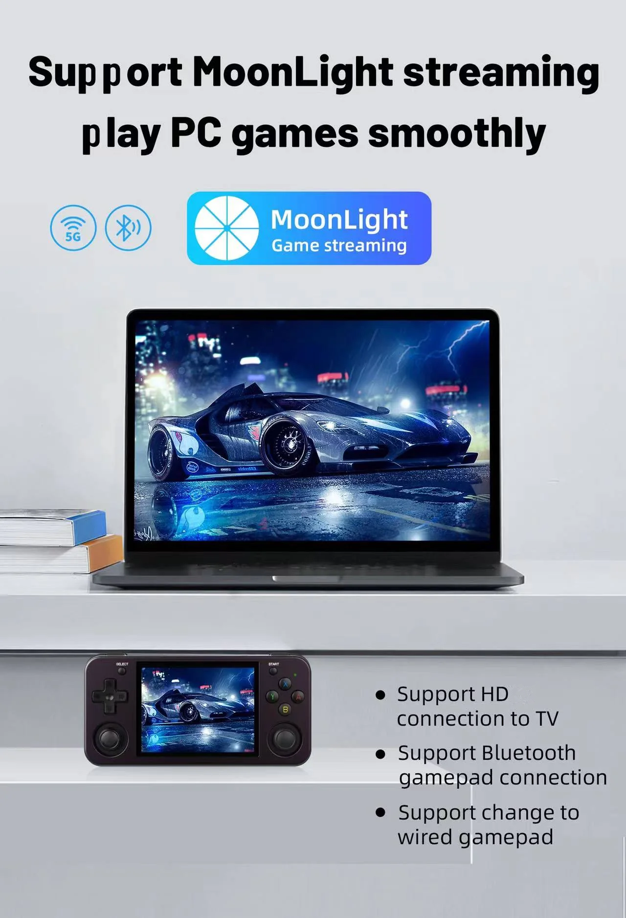 Built-in Hall joystick,Support WIFI online fighting, streaming, HD/Support 3.5mm stereo earphones/ Energy saving setting, Display brightness and other functional properties settings |