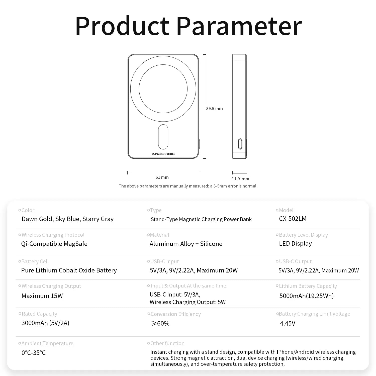 USB-C Input: 5V/3A, Wireless Charging Output: 5W