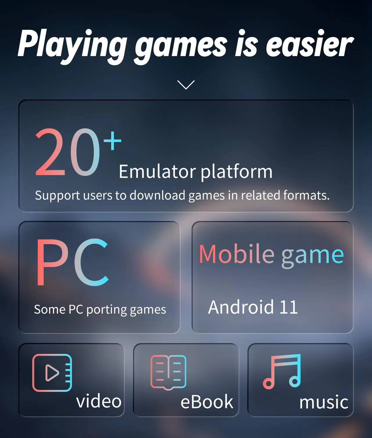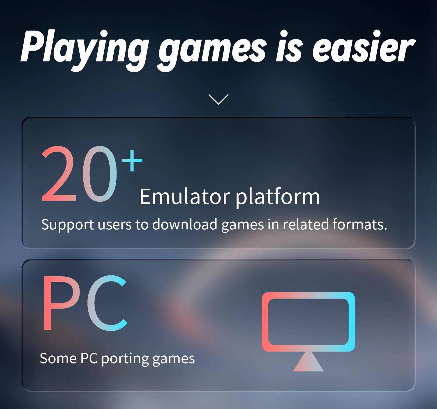 Supports :Some PC porting games and other more than 20 kinds of games format. Support users to download games in related formats.